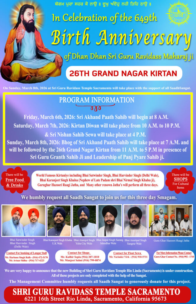 RIO LINDA, CA — One of the most vibrant and culturally significant traditions in the Sacramento region is returning to our streets. On Sunday, March 8, 2026, the Shri Guru Ravidass Temple will host the 26th Annual Nagar Kirtan Sikh Parade, bringing thousands of visitors from across the country to the heart of Rio Linda.