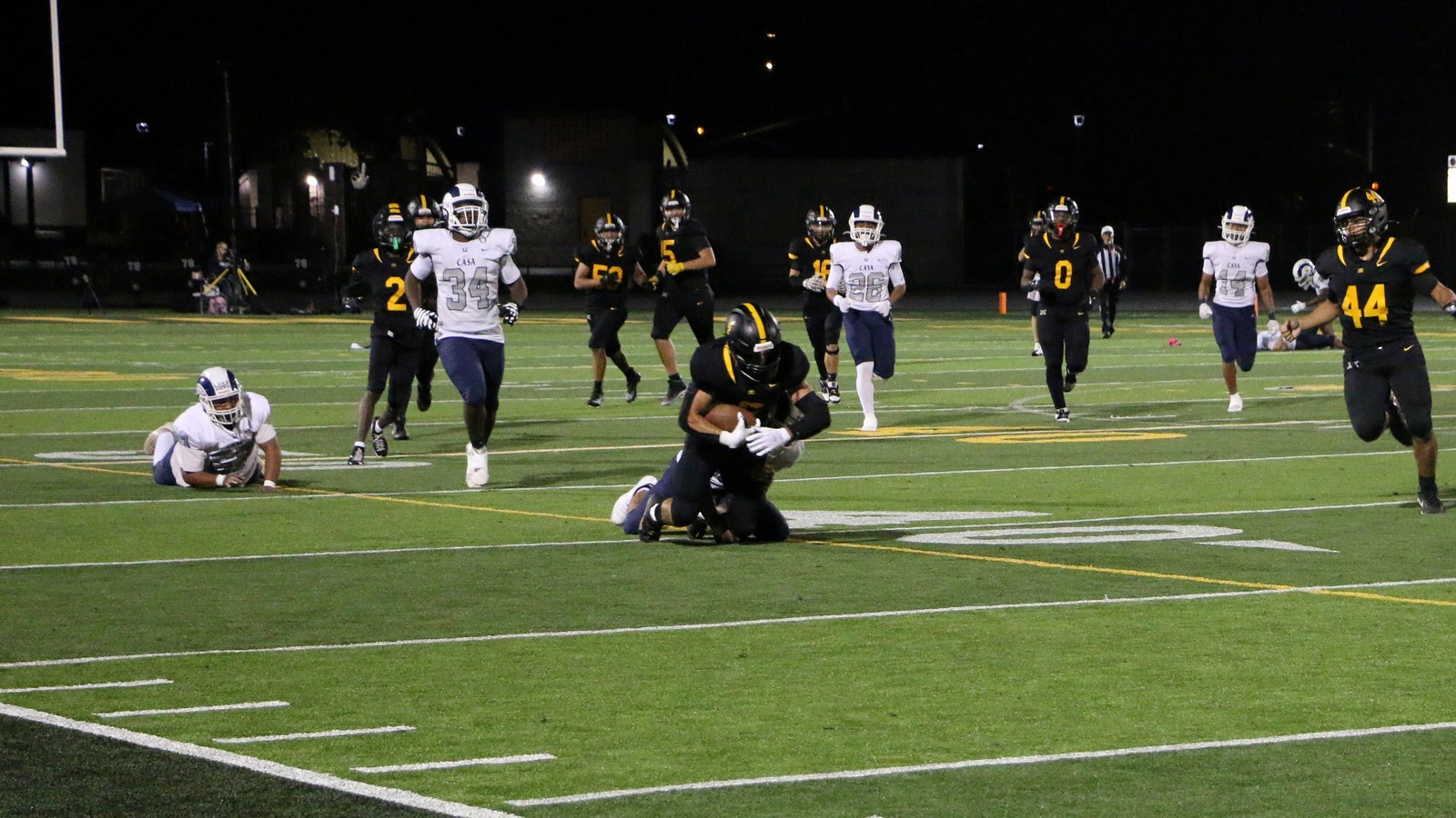 Casa Roble’s senior standout Jaylan Barcenas proved difficult to contain, rushing for 185 yards and two touchdowns while averaging nearly 10 yards per carry. Quarterback Aidan Lopez added 305 passing yards and two scores through the air, completing 78% of his passes. The Rams’ offensive efficiency, coupled with their ability to control possession, kept the Knights’ offense off the field for long stretches.