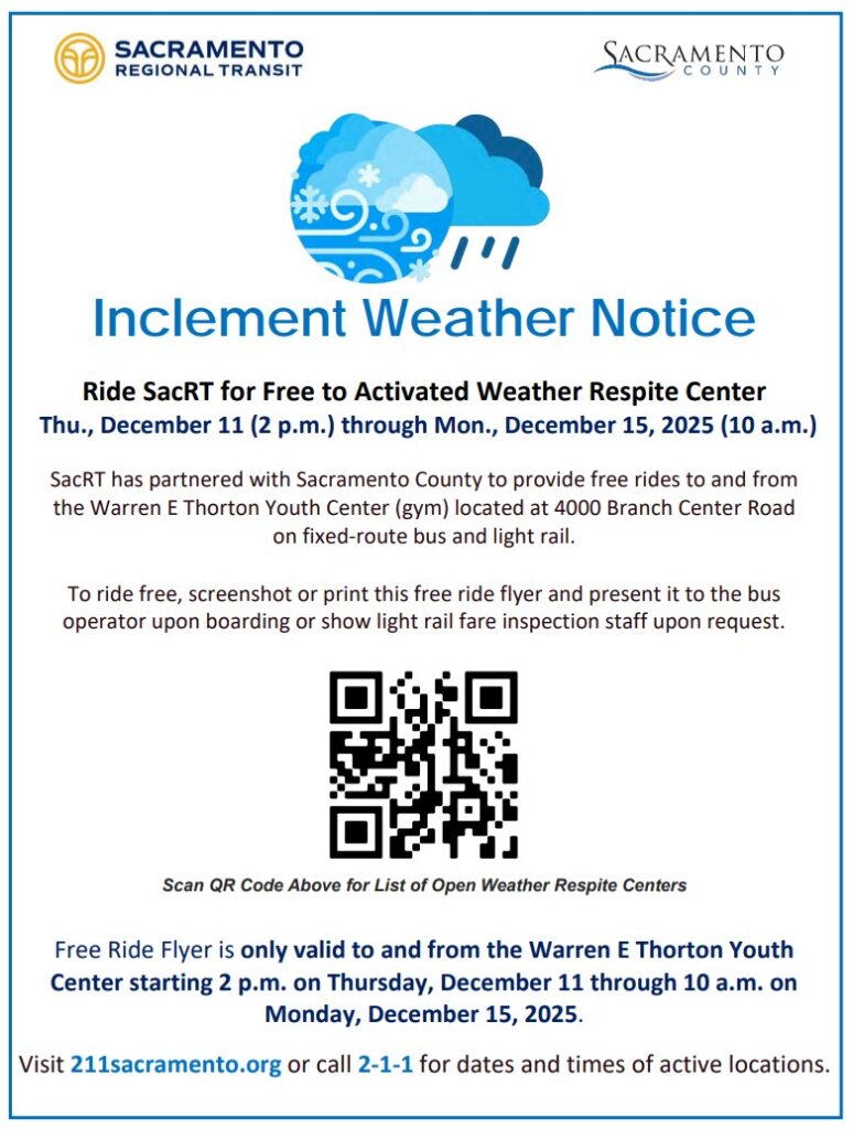 How to get there Since this location is in the Rosemont area, transportation is a key concern. Sacramento Regional Transit (SacRT) is supporting this activation by providing free rides to the respite location. Be sure to access the “Free Ride Flyer” (digital or printed) to present to the driver.